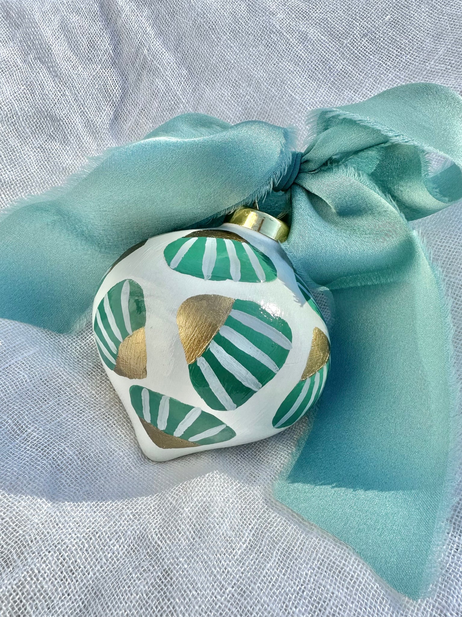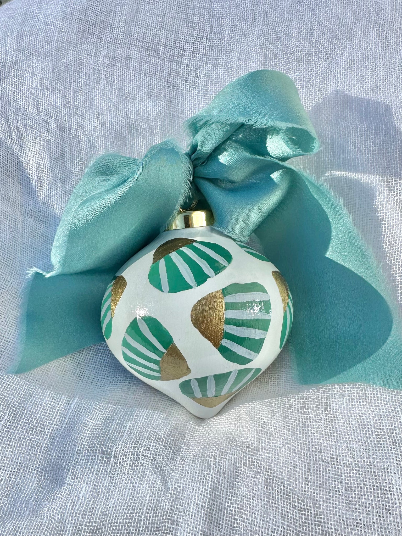Hand painted ceramic heirloom ornament. Adorned with a satin chiffon ribbon bow and hanging loop. Sealed to stand the test of time and last for generations to come!