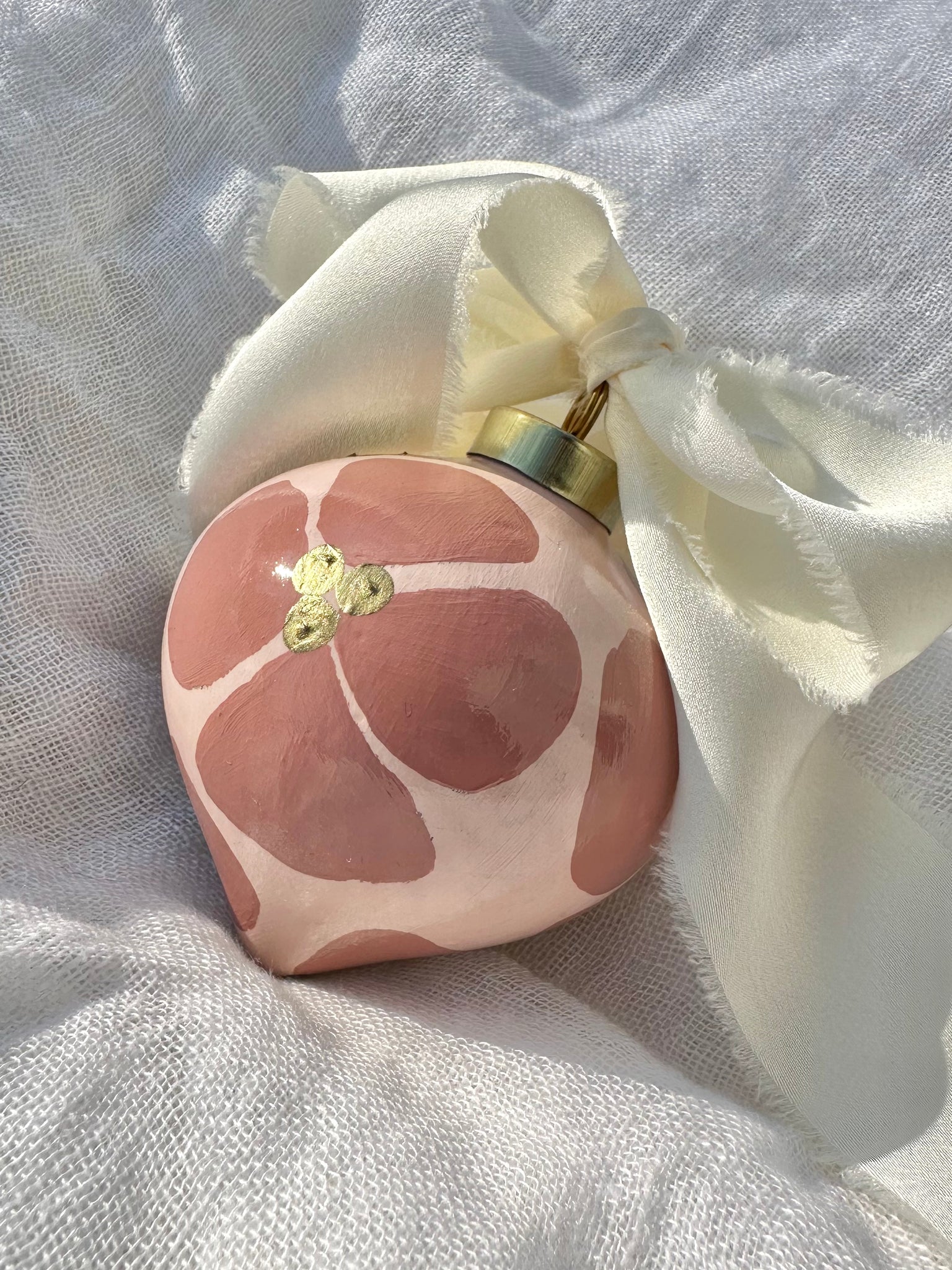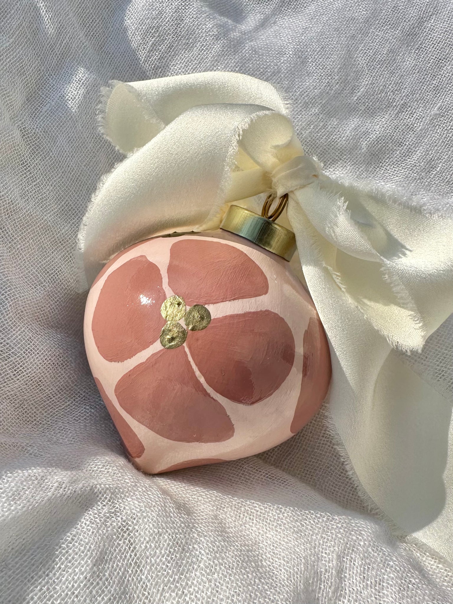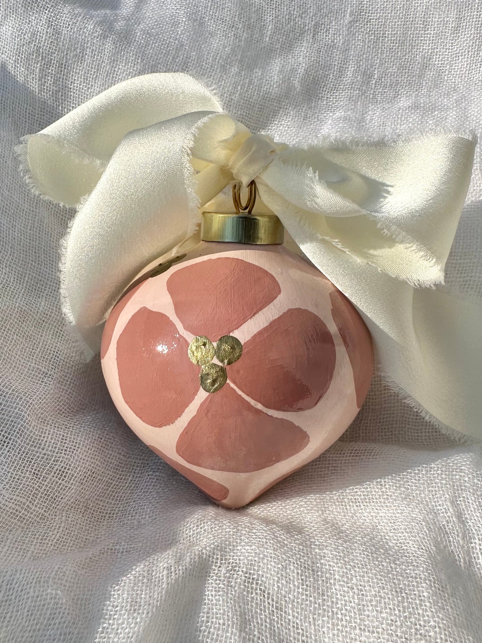 Hand painted ceramic heirloom ornament. Adorned with a satin chiffon ribbon bow and hanging loop. Sealed to stand the test of time and last for generations to come!